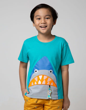 Little M Short Sleeve T-Shirt Shark Fish Hanging Embroidery Application