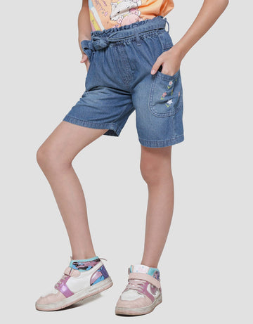 Little M Embroidered Flowers On Pockets Of Girls Denim Shorts