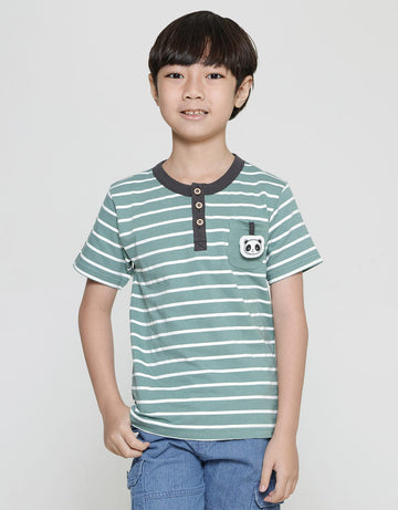 Little M Henley Stripe Print Panda Embroidery Boys Short Sleeve T-Shirt