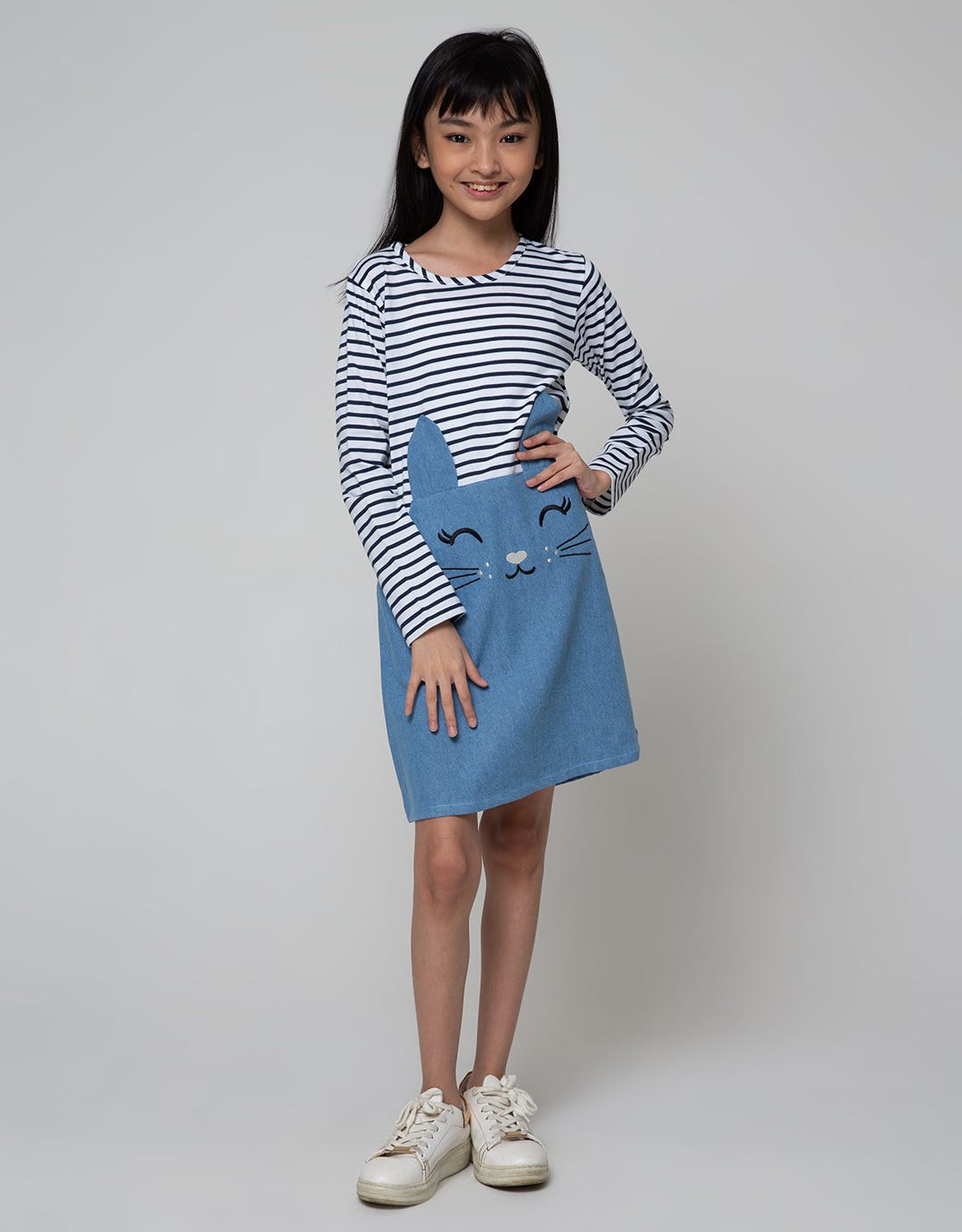 Aero Long Sleeve Dress Striped Cat Face Denim
