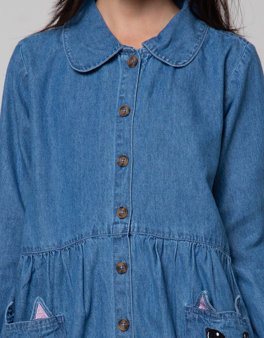 Aero Long Sleeve Midi Dress Cat Ear Embroidery Pockets