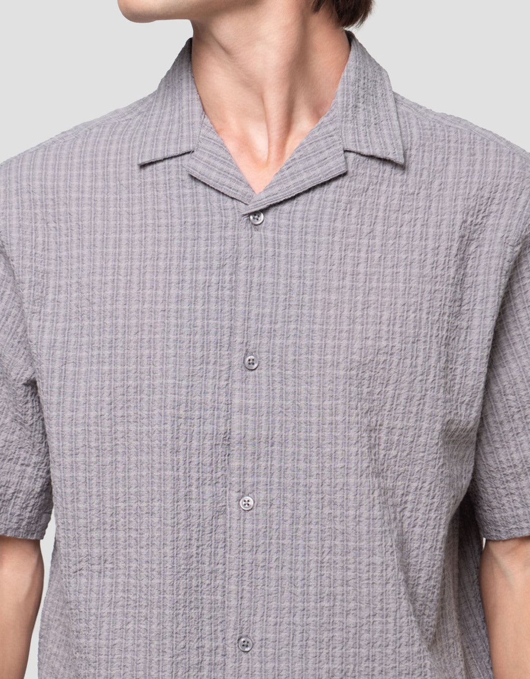 • Detail kancing depan, kerah, lengan pendek