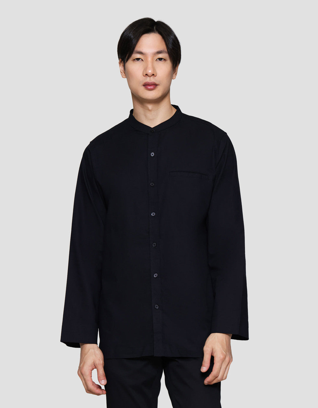 - Lengan panjang dan kancing depan