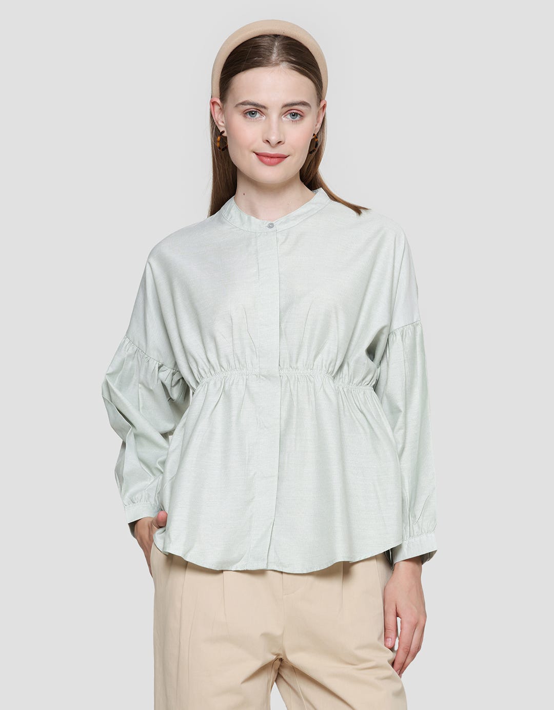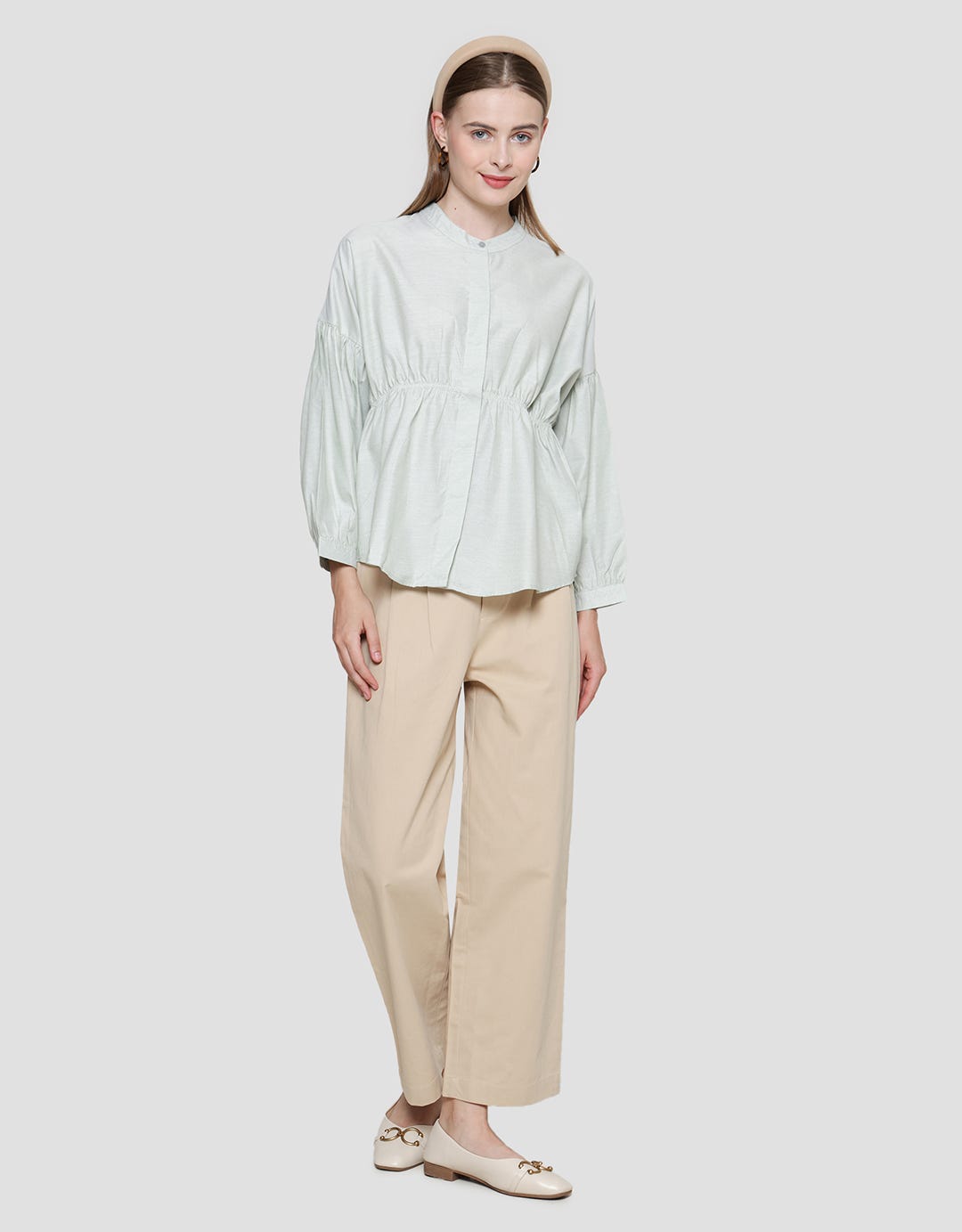 - Stretch detail at waist, front button, long sleeves