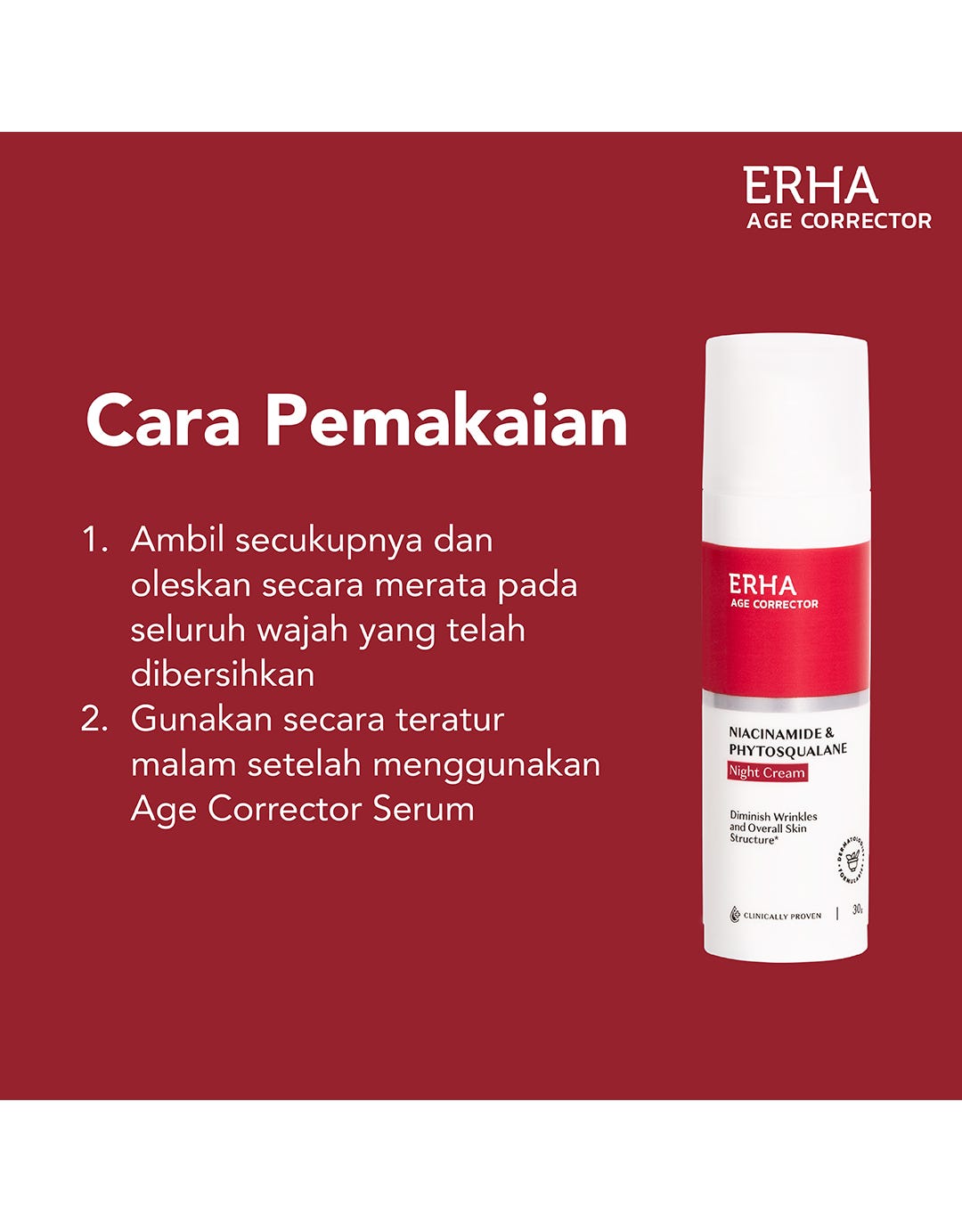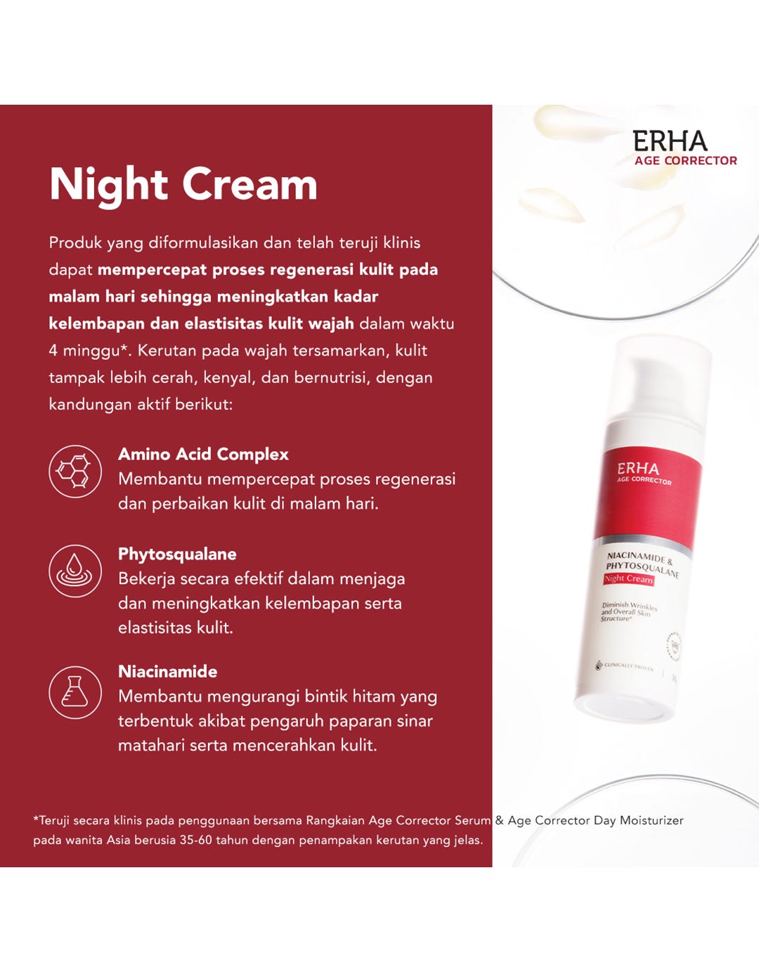 Regenerate Your Skin With The Best Regenerating Night Cream! Night Is The Best Time For Skin To Regenerate. Therefore, Use Erha Anti-Aging Moisturizer Products With The Best Formulation, Such As Age Corrector Niacinamide & Phytosqualane Night Cream. Moisturizers That Are Specially Formulated To Help Accelerate The Process Of Regenerating New Skin Cells, Help Brighten And Disguise Dark Spots, Fine Lines, And Signs Of Aging Due To UV Rays And Free Radicals.