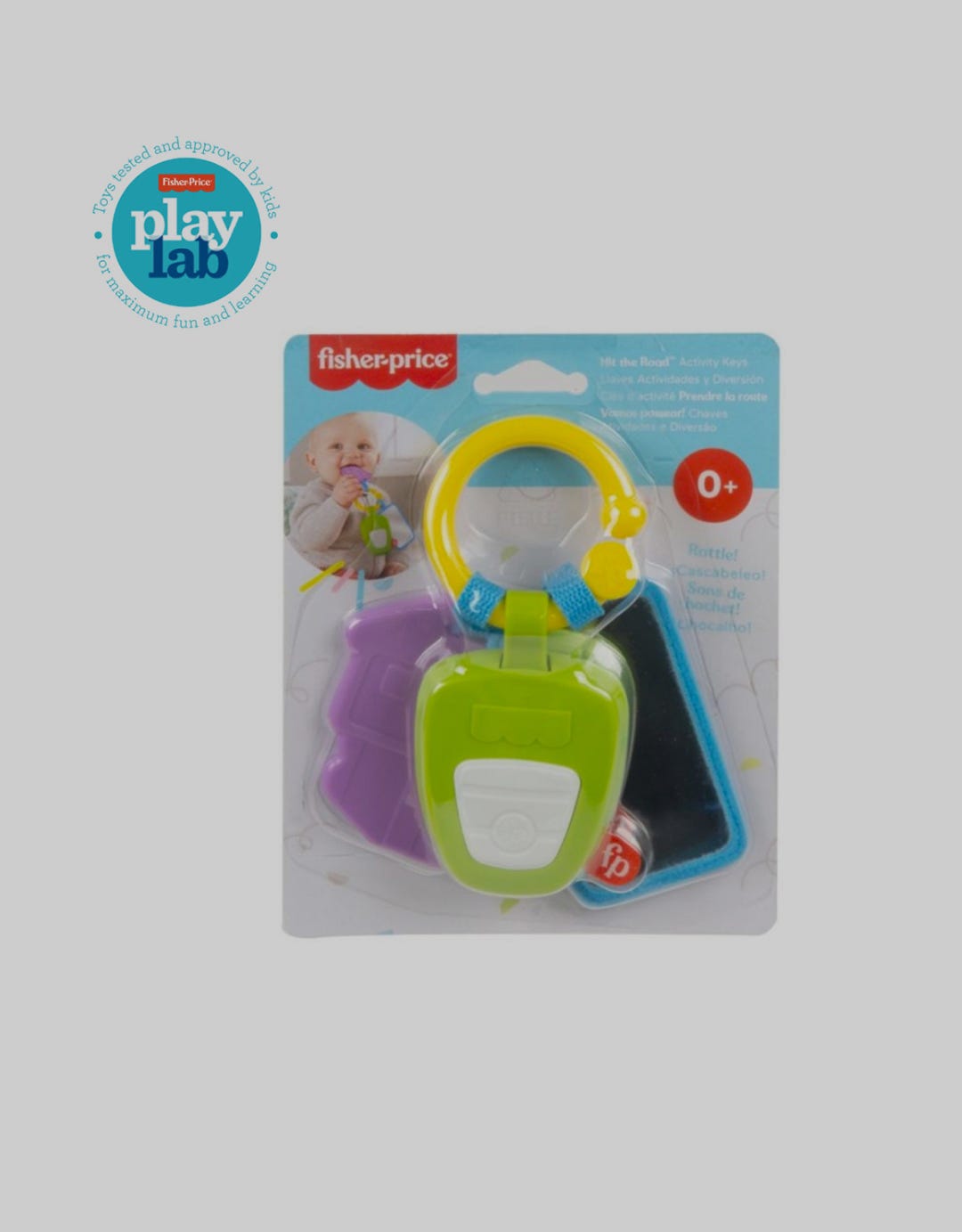 Baby gets a license to play with Fisher-Price’s Hit the Road Activity Buttons! This pretend key set includes a squishy keychain, a car key toy, and an “ID” card mirror. A convenient link lets you attach the toys to your stroller or bag when heading out with your favorite travel buddy.
