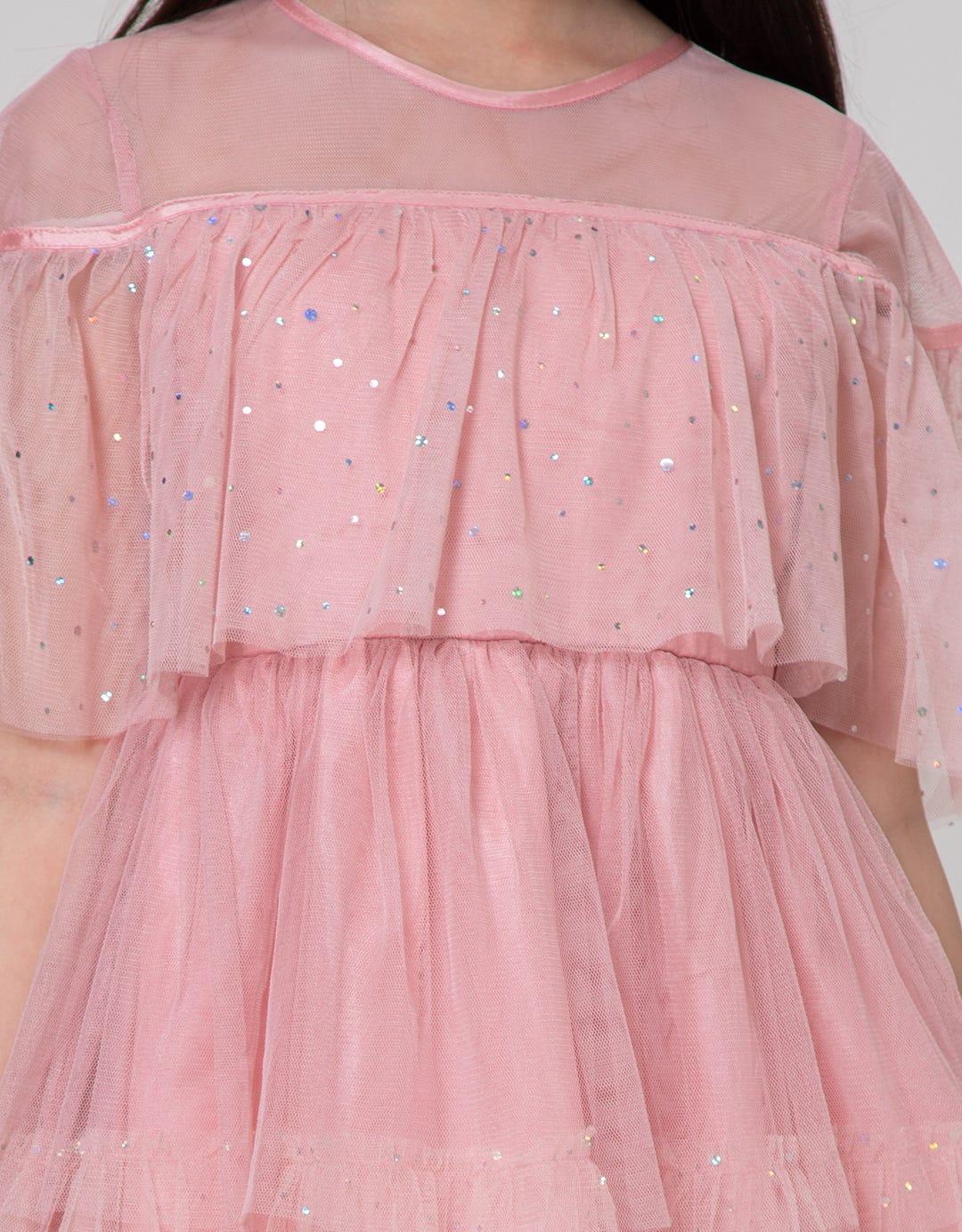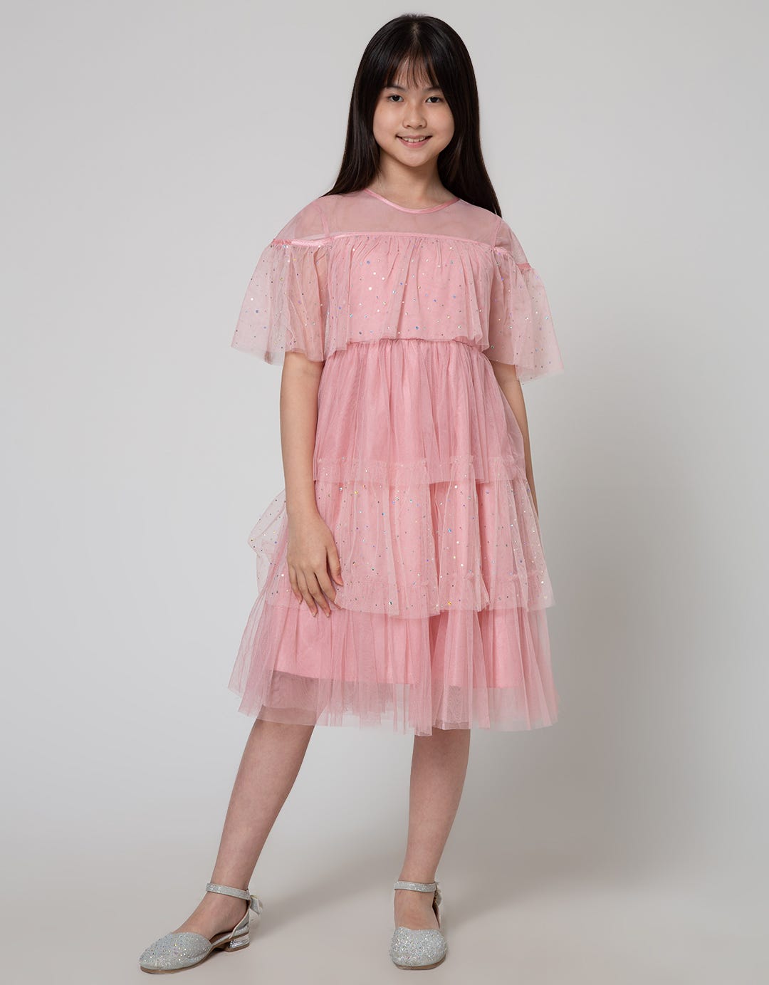 Kidz Too Short Sleeve Midi Dress Geber Tiered Tulle Beads