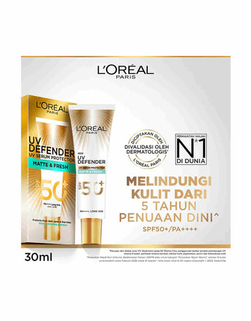 BARU! L'OREAL PARIS UV Defender Matte & Fresh Matte & Fresh UV Serum Protector melindungi kulit dari sinar UV dan membantu menghasilkan kulit tidak tampak berminyak dan menyamarkan pori pori. Matte & Fresh UV Serum Protector cocok untuk kulit berminyak dan mereka yang membutuhkan oil control/sebum control. Meninggalkan hasil matte pada kulit bahkan pada cuaca panas dan lembap. Diuji pada suhu 45C dan kelembapan 80%
