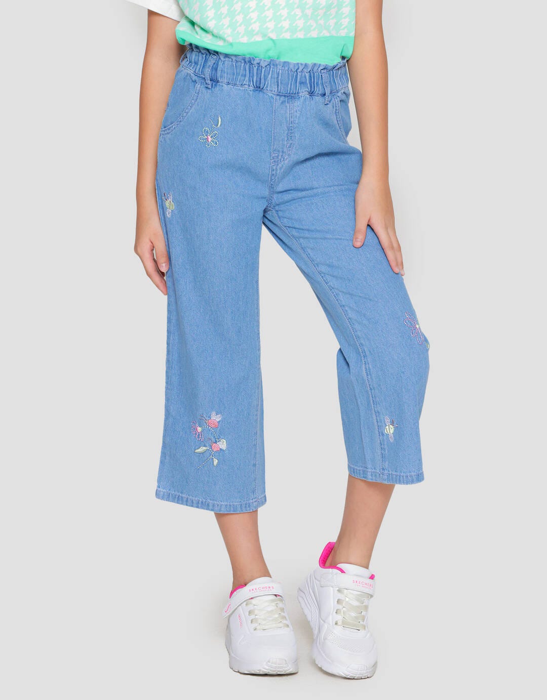 Little M Flower Bee Embroidery Girls Denim Long Pants