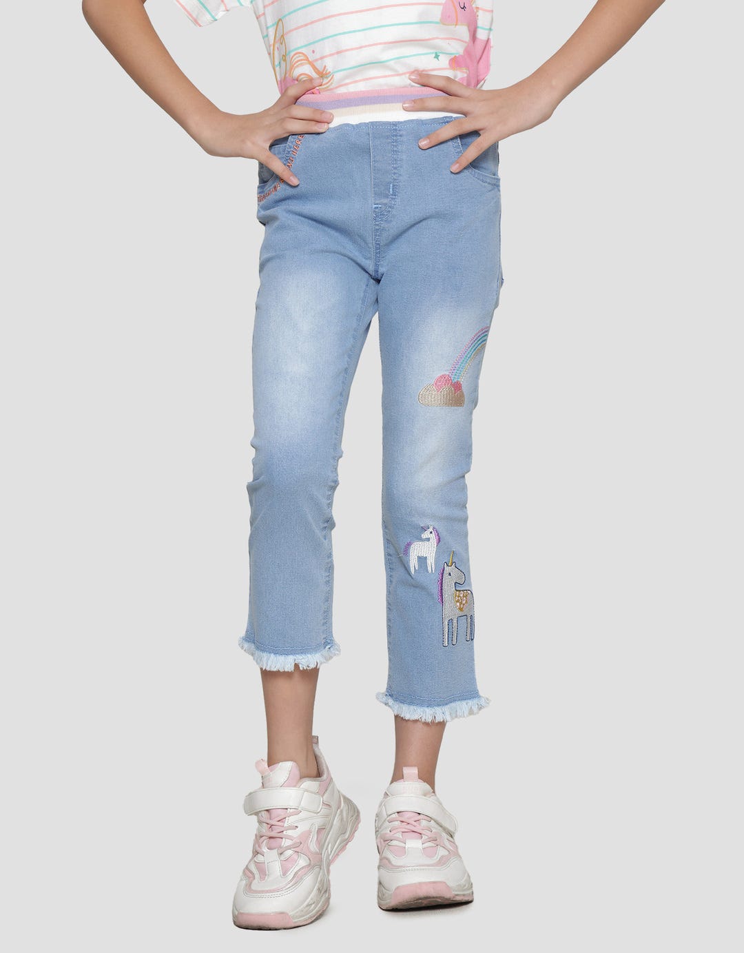 Little M Rib Unicorn Embroidery 2 Rainbow Girls Denim Jeggings