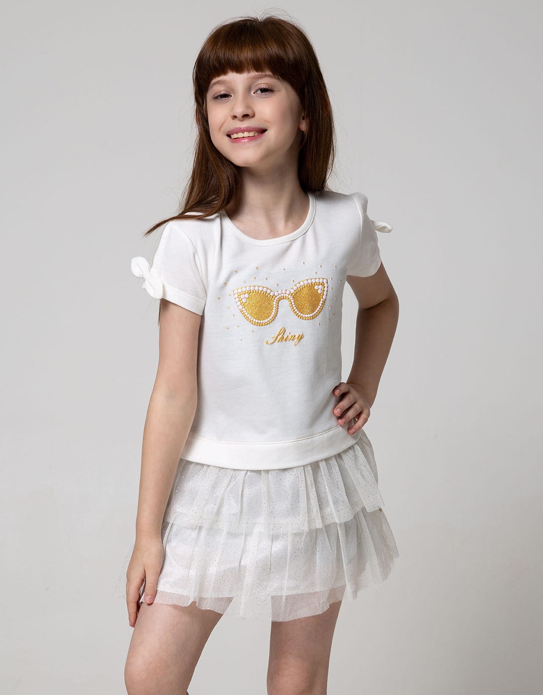 Little M Dreshort with a skirt gives the child a sweeter appearance. The elegant skirt motif is very harmonious with the top with a gold color on its motif. Made of quality cotton material that is comfortable to wear. The opportunity for children to appear more beautiful will be more attractive on every occasion.