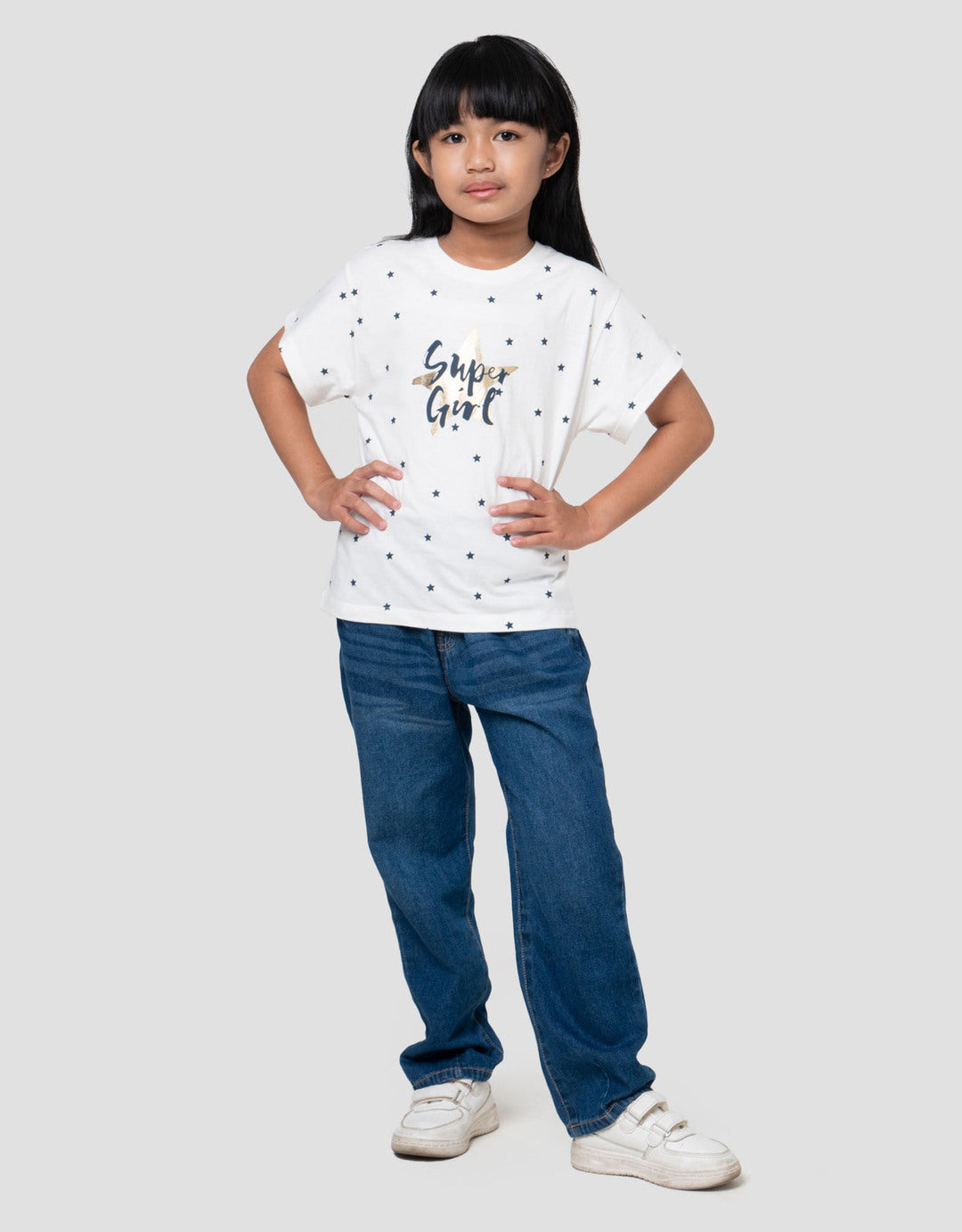 Kaos anak perempuan dengan model yang simple dan casual, cocok untuk dijadikan outifit keseharian saat anak beraktifitas. Bahan yang berkualitas akan nyaman saat digunakan sepanjang hari.