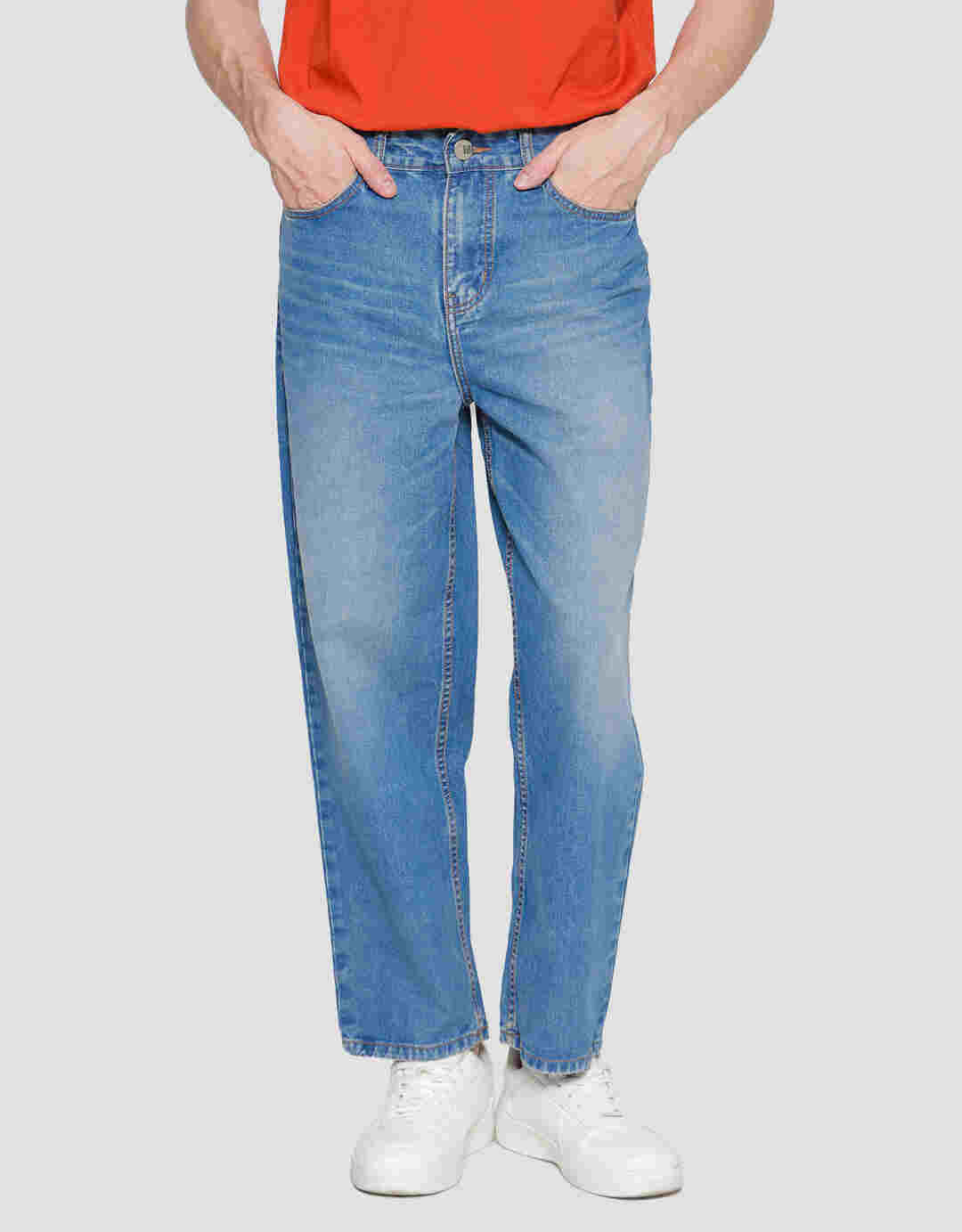 • Front button and zipper details, belt loops, pockets