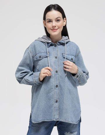 Nevada Long Sleeve Shirt Denim Shacket Hoodie