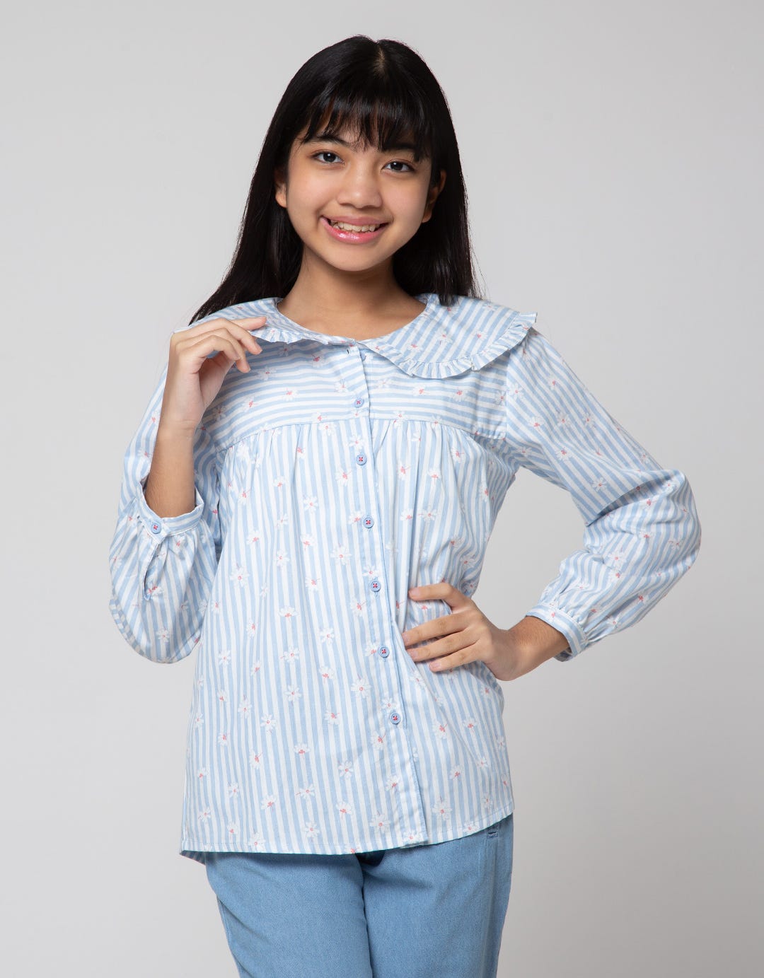 Nevada Long Sleeve Shirt Stripes And Flowers With Big Collar