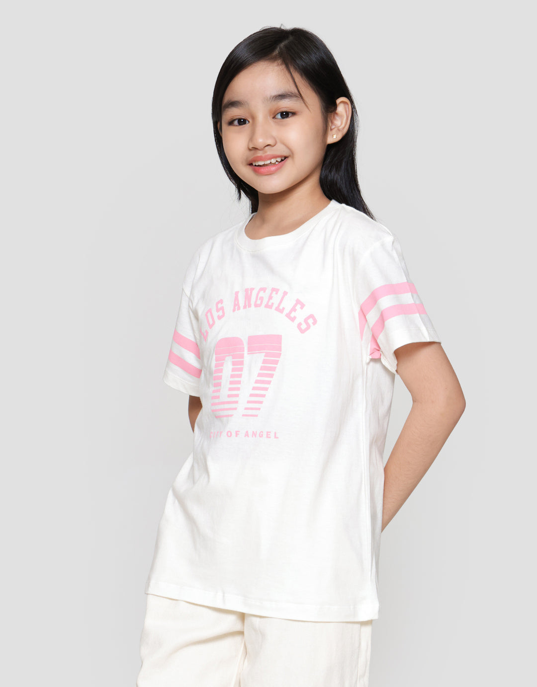 Kaos anak perempuan dengan model yang simple dan casual, cocok untuk dijadikan outifit keseharian saat anak beraktifitas. Bahan yang berkualitas akan nyaman saat digunakan sepanjang hari.