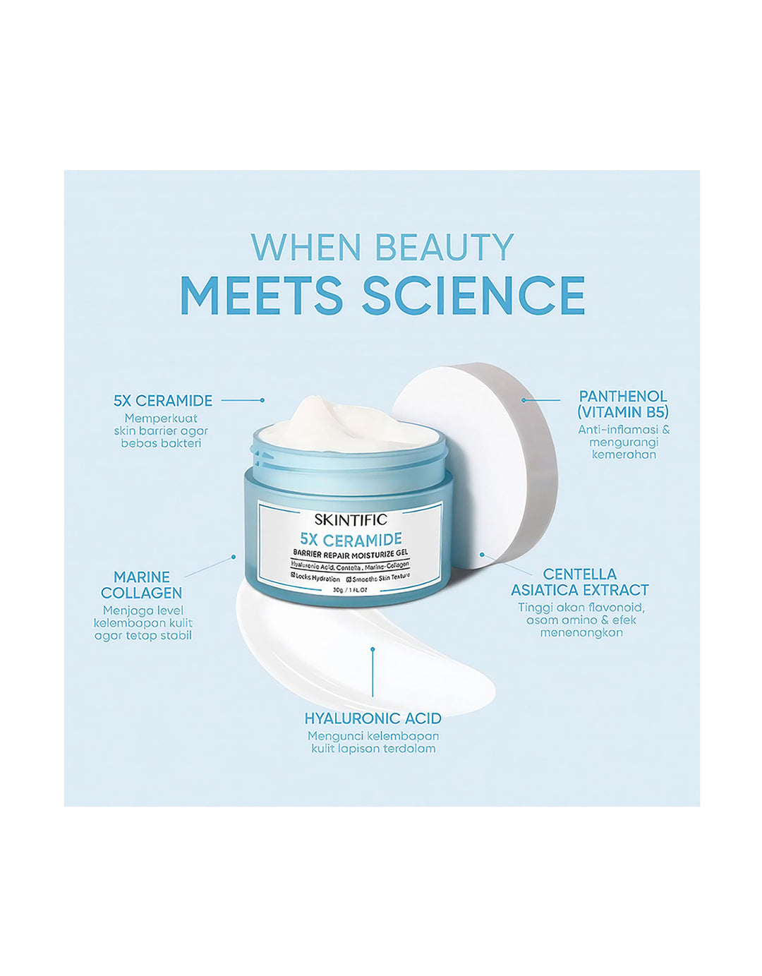 - Bahan: 5X Ceramide, Asam Hialuronat, Centella Asiatica, Kolagen Laut