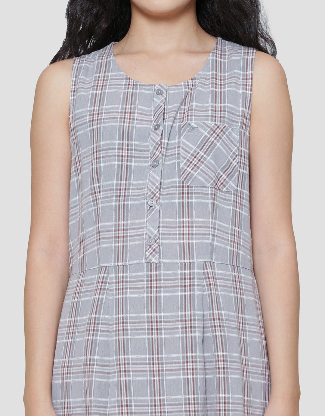 - Round neck detail, sleeveless, front buttons