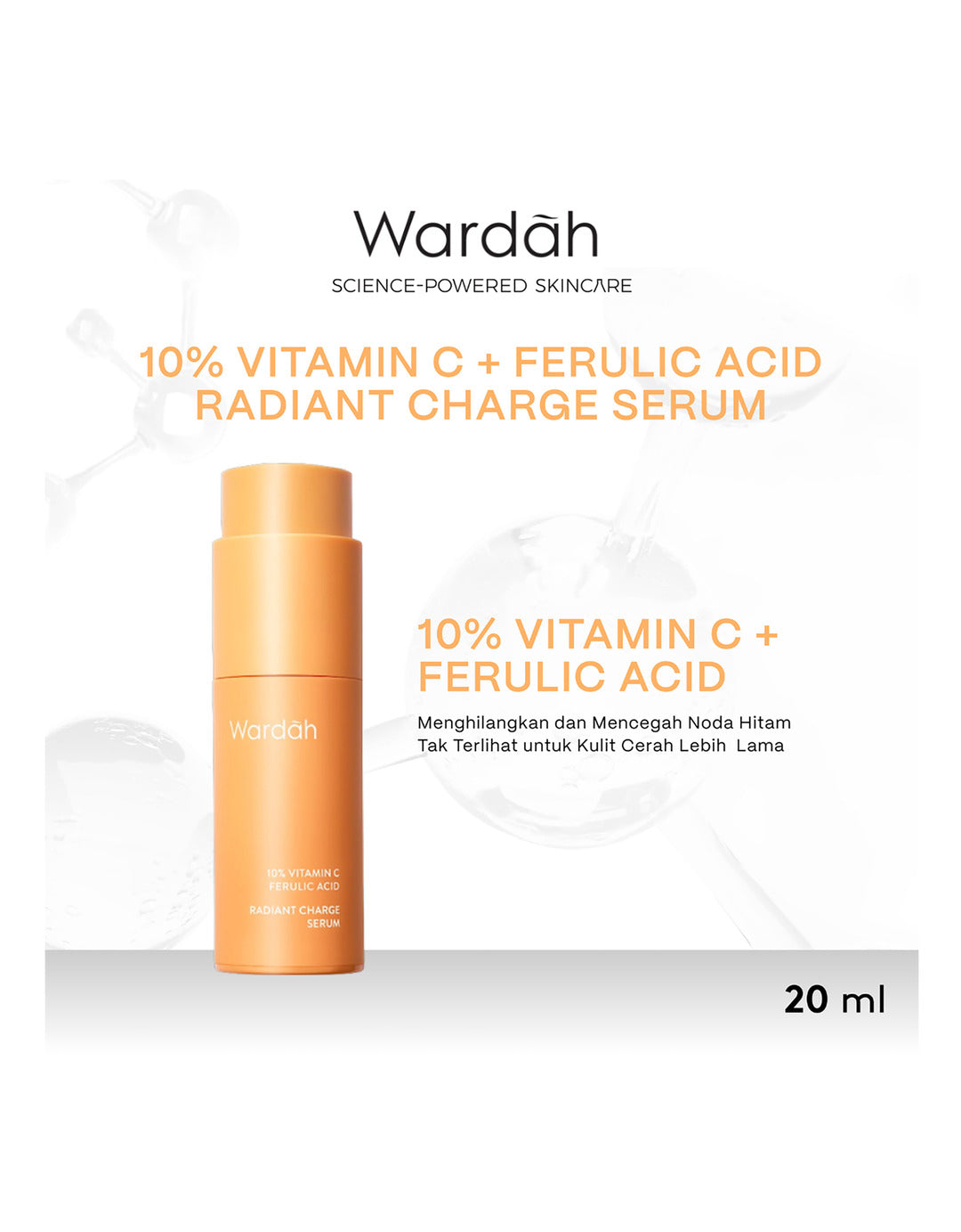 Wardah 10% Vitamin C + Ferulic Acid Radiant Charge Serum 20 ml adalah serum pencerah yang sangat efektif dengan formula Deep Targeted Vitamin C yang stabil dan menyerap 5x lebih cepat. Serum ini ringan, cepat meresap, aroma citrus soft, dan terbukti mencerahkan, menyamarkan noda hitam serta meratakan warna kulit dalam 2-4 minggu tanpa rasa lengket.