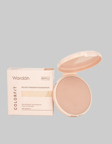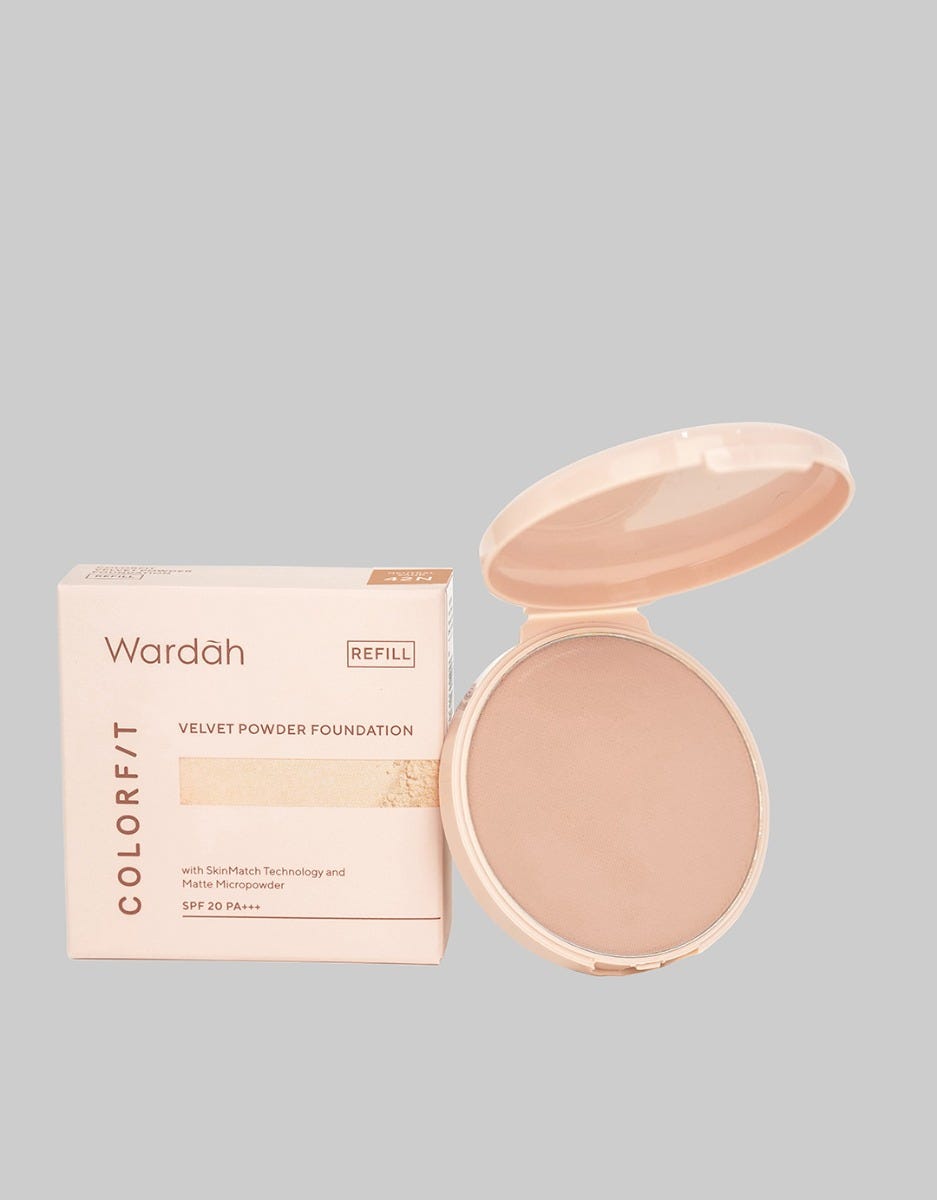 Wardah Colorfit Velvet Powder Foundation is a combination of foundation and powder that feels smooth to provide natural yet buildable coverage (can be adjusted for medium to high coverage). Able to provide a finish that can blend well with the face and is able to disguise pores and hold oil for up to 12 hours.