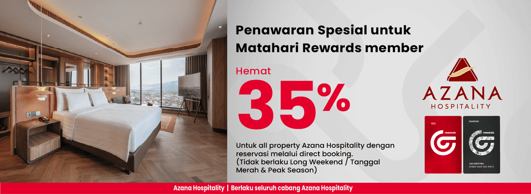 3. Promo untuk member Matahari Rewards di Azana Hospitality Indonesia, diskon 35% untuk all property Azana Hospitality dengan melalui direct booking dan tidak berlaku black out date (long weekend, tanggal merah dan peak session)