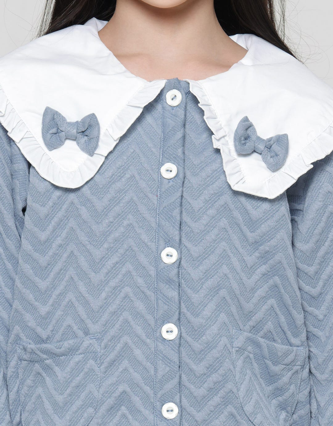 - Detail kerah, kancing depan, lengan panjang