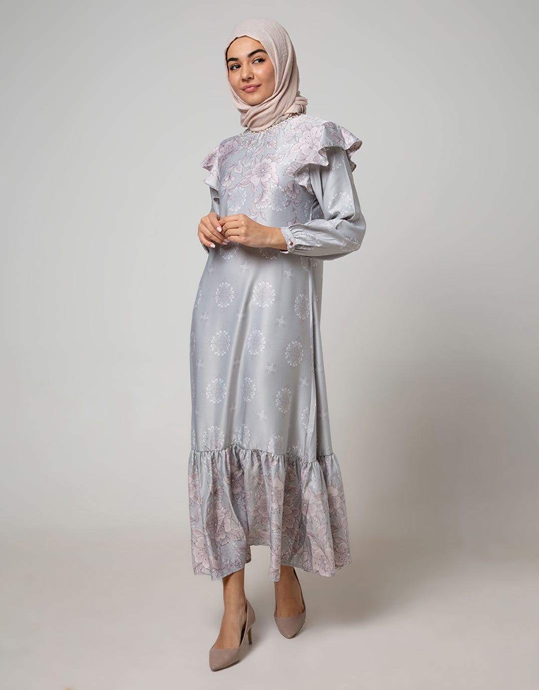 Annisa Long Sleeve Maxi Gamis Magnolia Print With Beaded Neckline