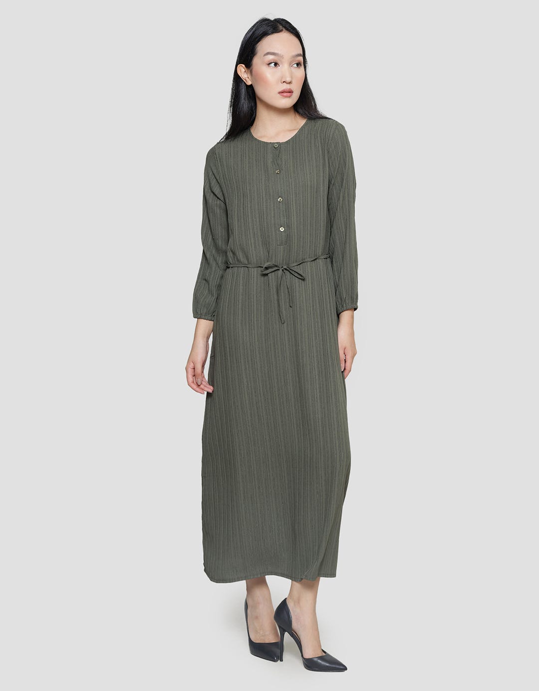 - Detail kerah bulat, kancing depan, tali ikat pinggang