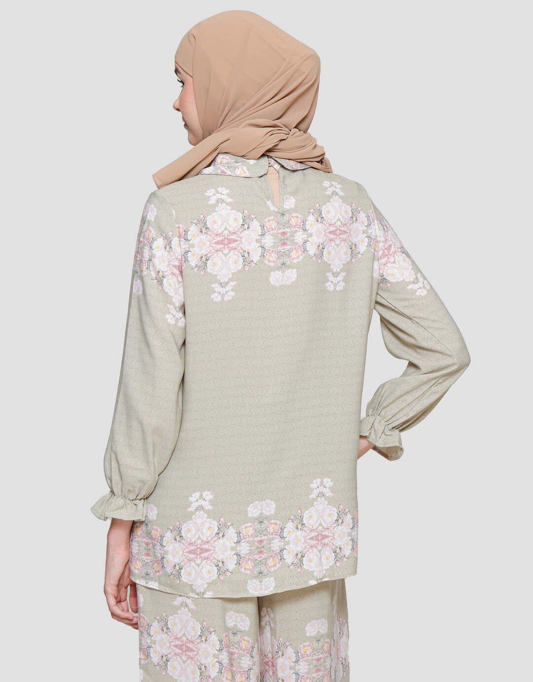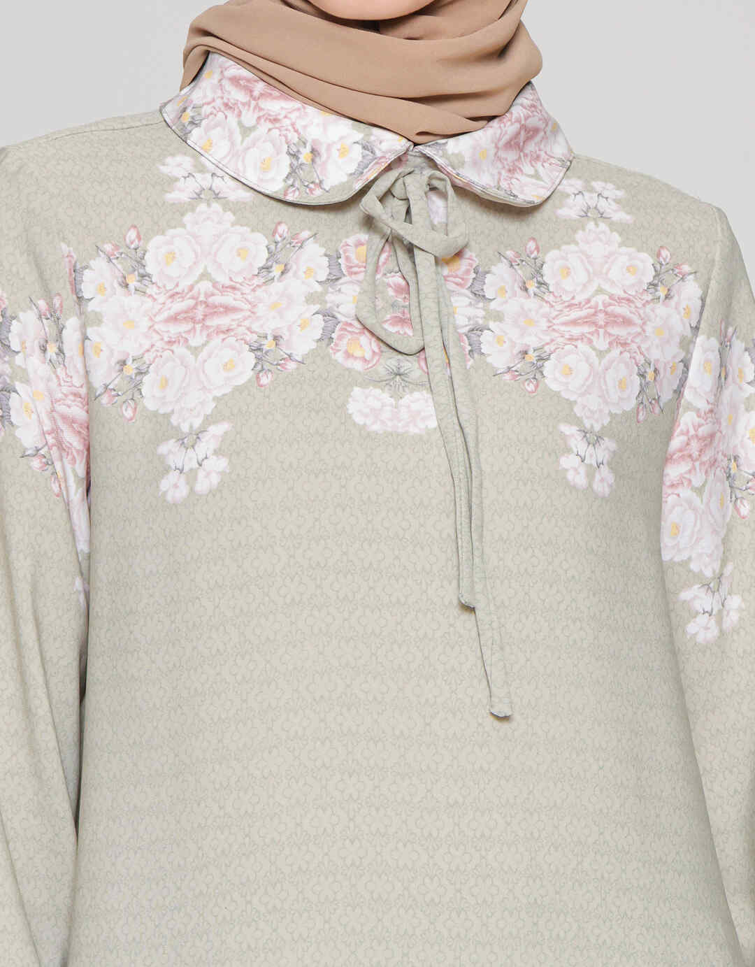 - Detail kancing belakang, kerah dengan tali pita, lengan panjang
