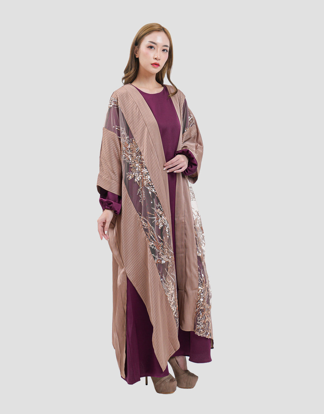 Perpaduan desain modern dan bahan premium menjadikan gamis ini pilihan utama untuk Hari Raya. Siluetnya yang lembut menciptakan kesan feminin yang elegan. Busana ini siap melengkapi momen spesial Anda.
