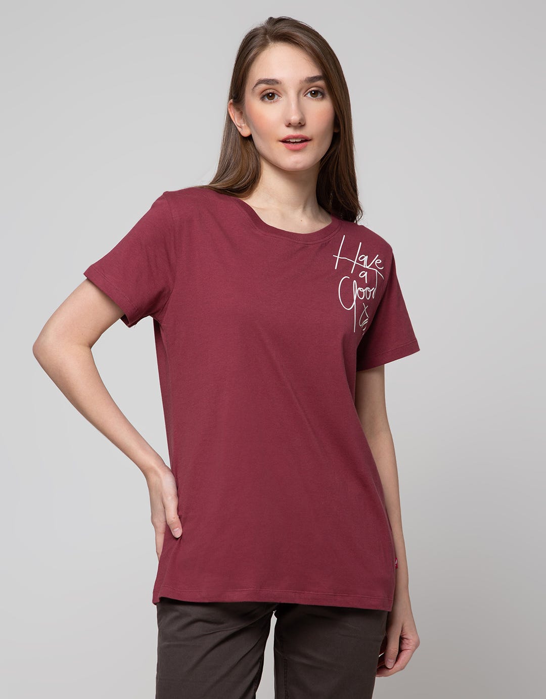 Kaos wanita dengan design yang simple dan casual, nyaman untuk dijadikan outfit keseharian saat beraktifitas sepanjang hari.