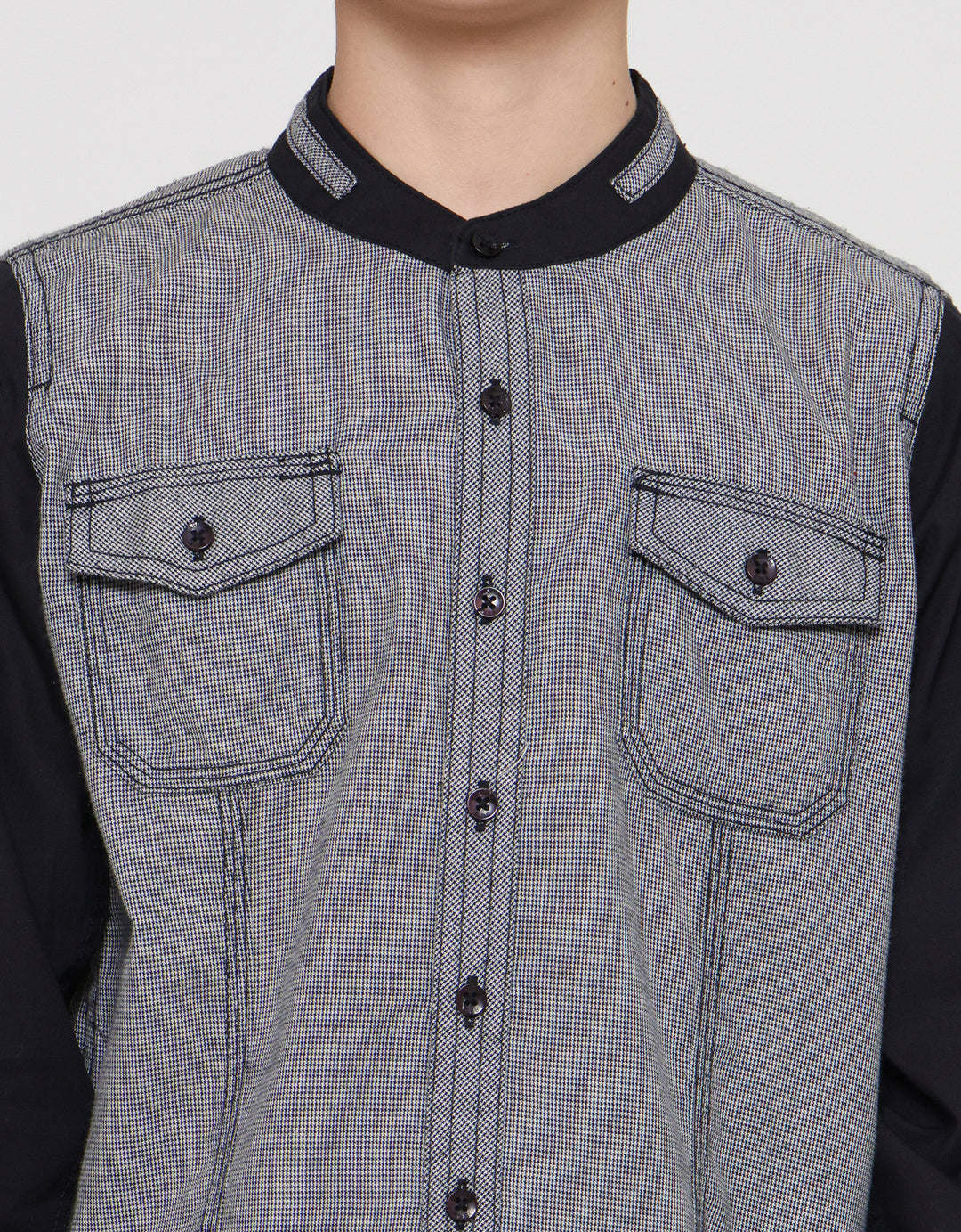 - Detail kancing dan kantong depan, kerah tinggi, lengan panjang