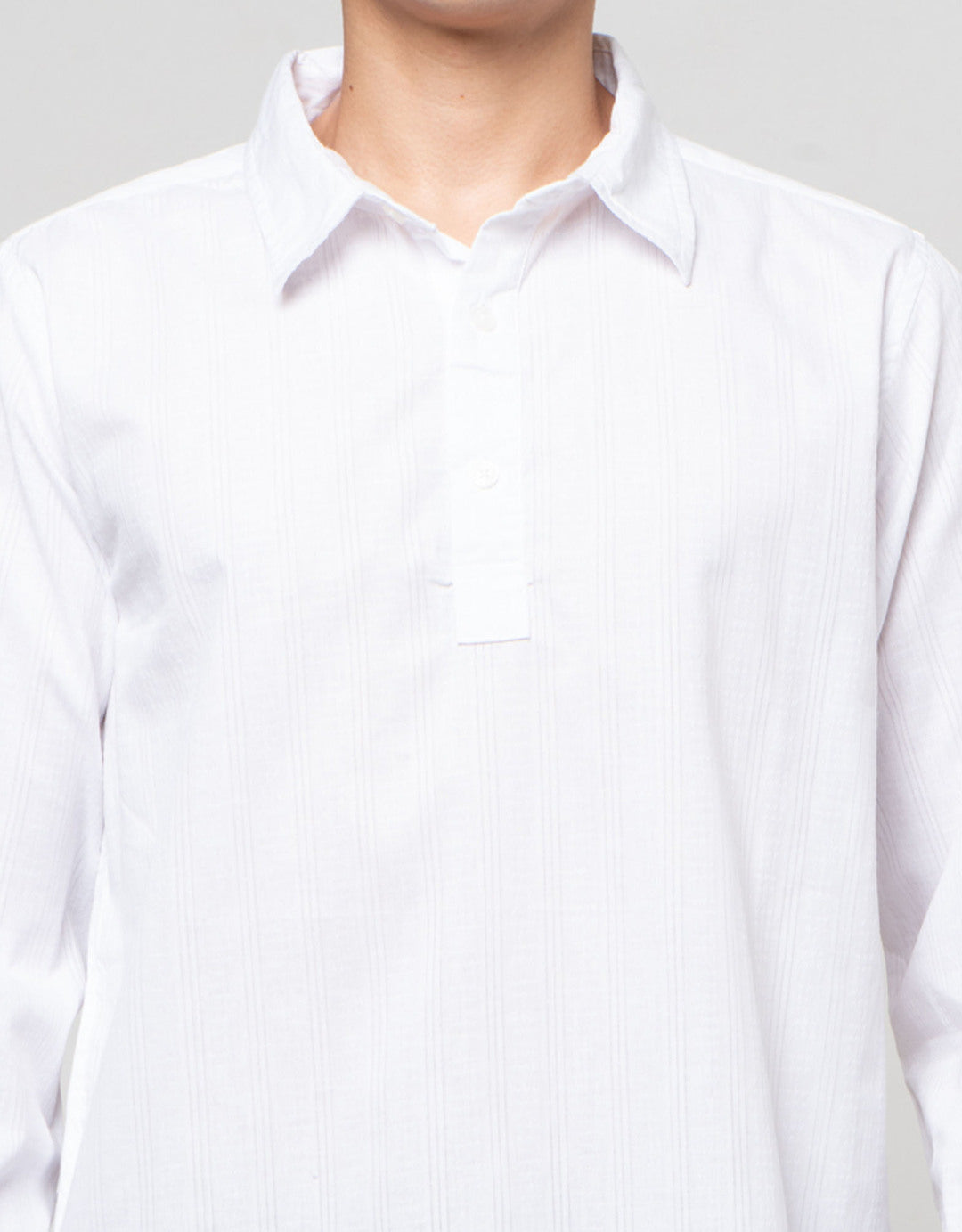 - Detail kancing depan, kerah, lengan panjang