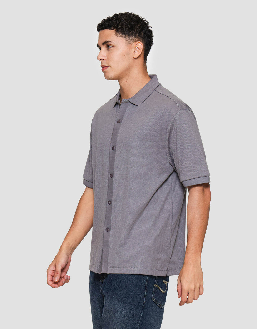 - Detail kancing depan, kerah, lengan pendek
