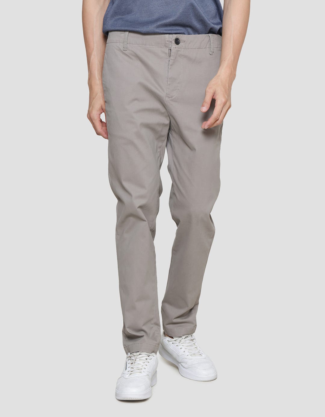 - Detail kancing dan resleting depan, belt loops