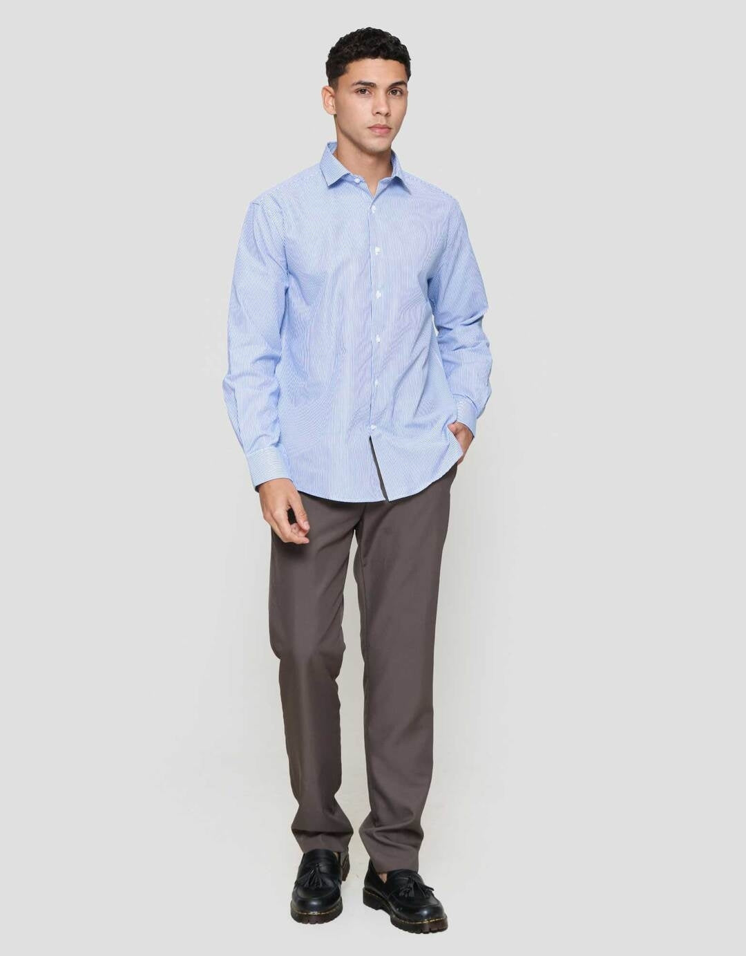 Kemeja pria yang cocok digunakan sebagai outfit keseharian saat pergi ke kantor. Model yang simple dan timeless, mudah dipadankan dengan bawahan kesukaan Anda.
