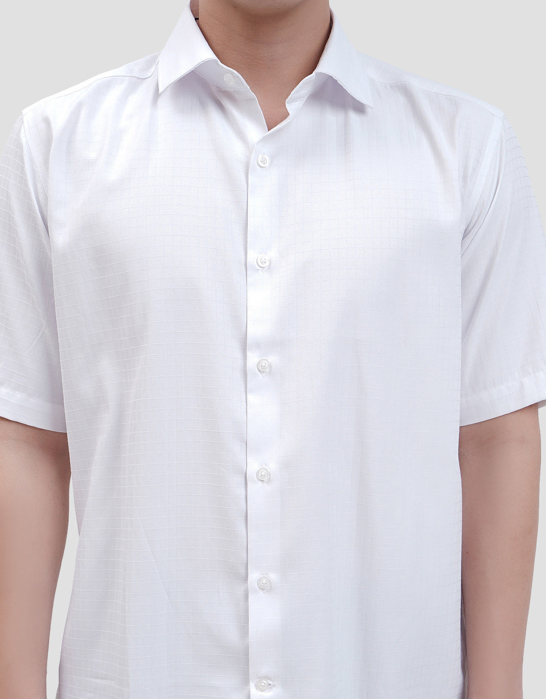 • Detail kancing depan, kerah, lengan pendek