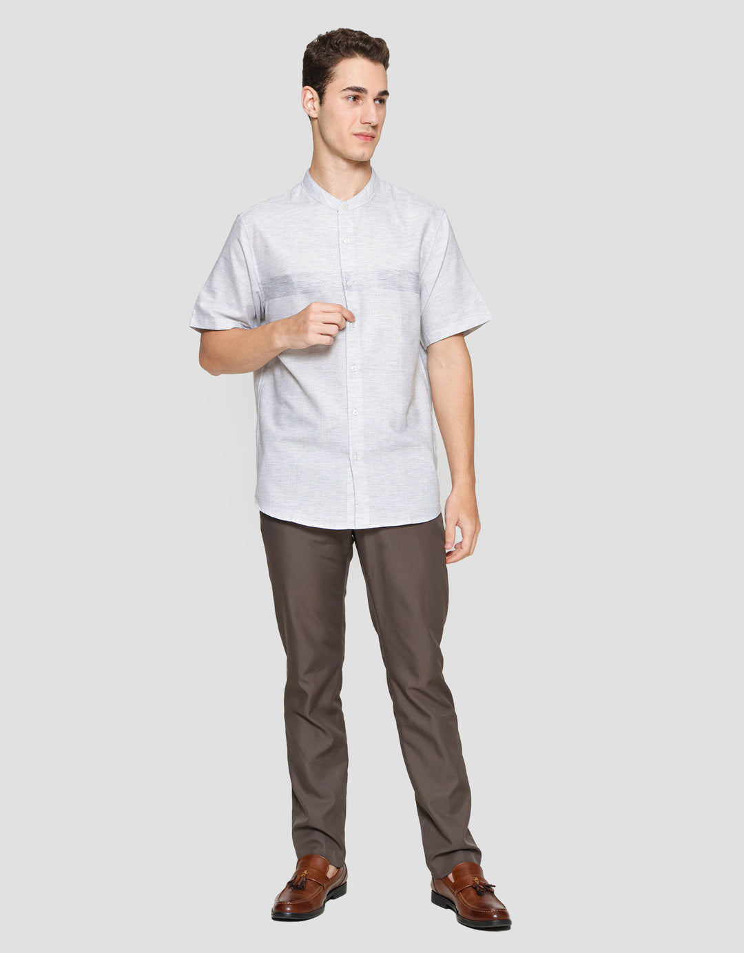 - Detail kancing depan, lengan pendek