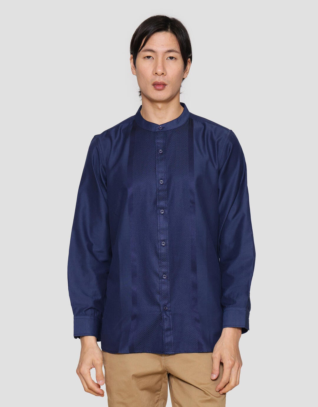 - Detail kancing penuh depan, lengan panjang