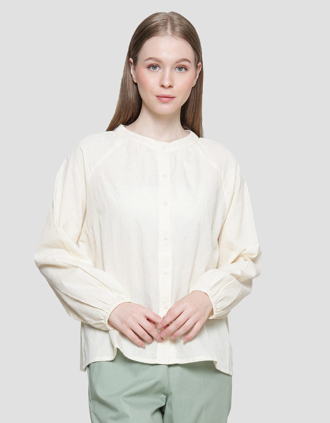 - Detail kerah tinggi, kancing depan, lengan panjang
