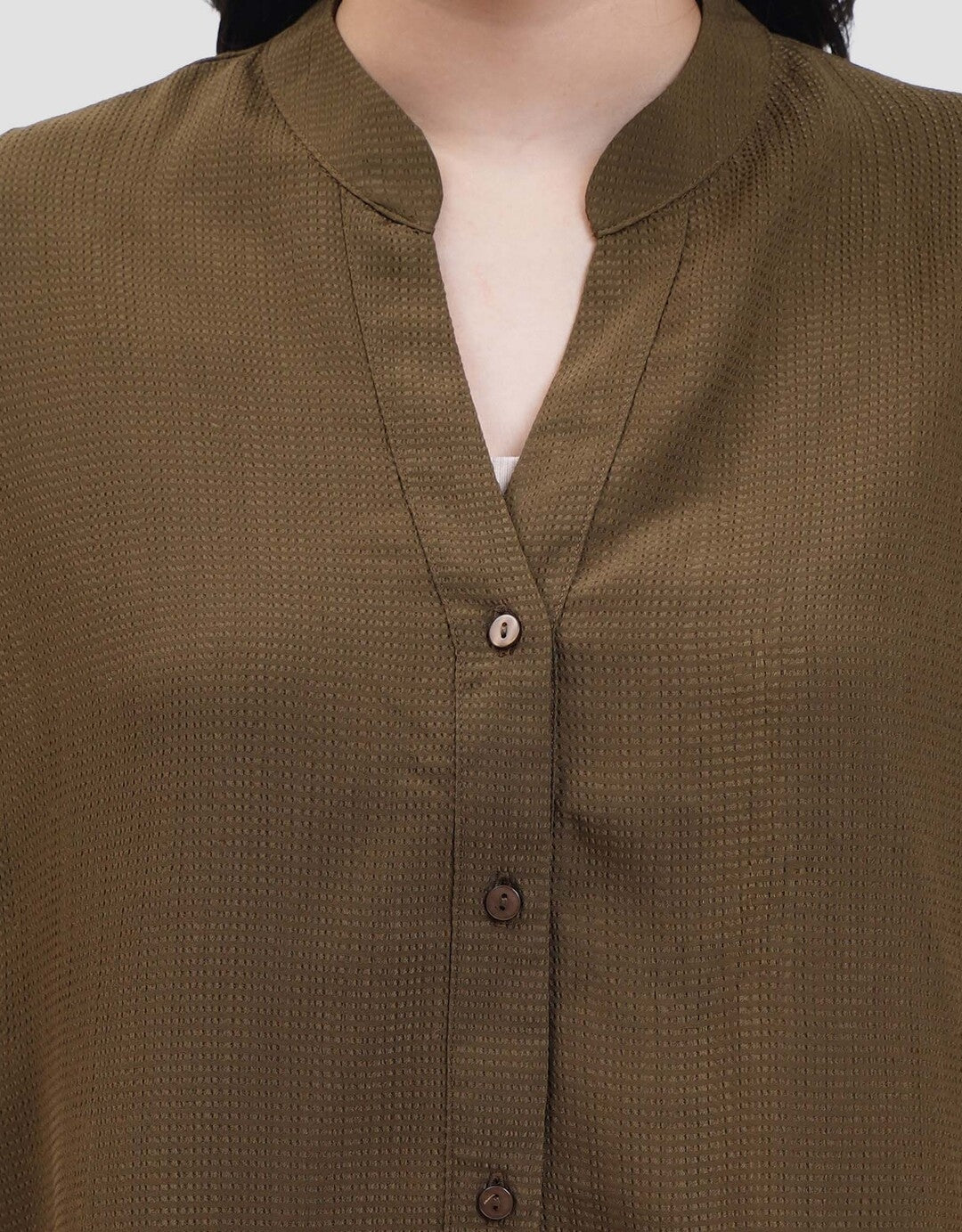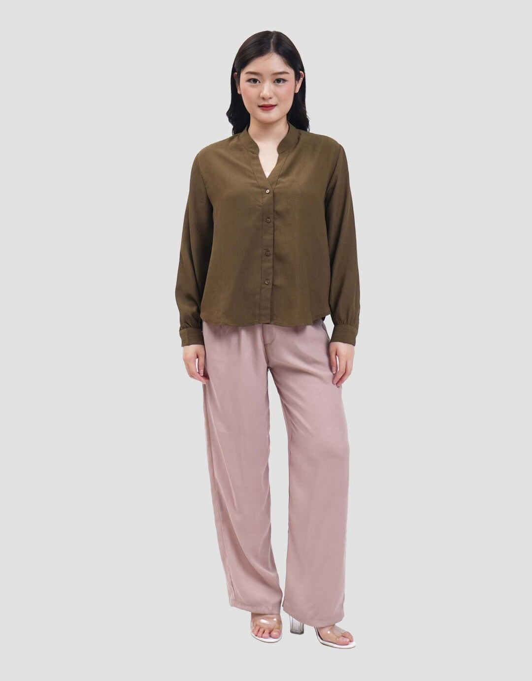 Tampil profesional dan berkelas dengna blouse ini. Memiliki potongan kerah Sanghai dengan bukaan V-Neck yang memberikan kesan leher lebih jenjang. Atasan ini juga bisa menjadi pilihan tepat untuk ke kantor, atau acara formal lainnya.
