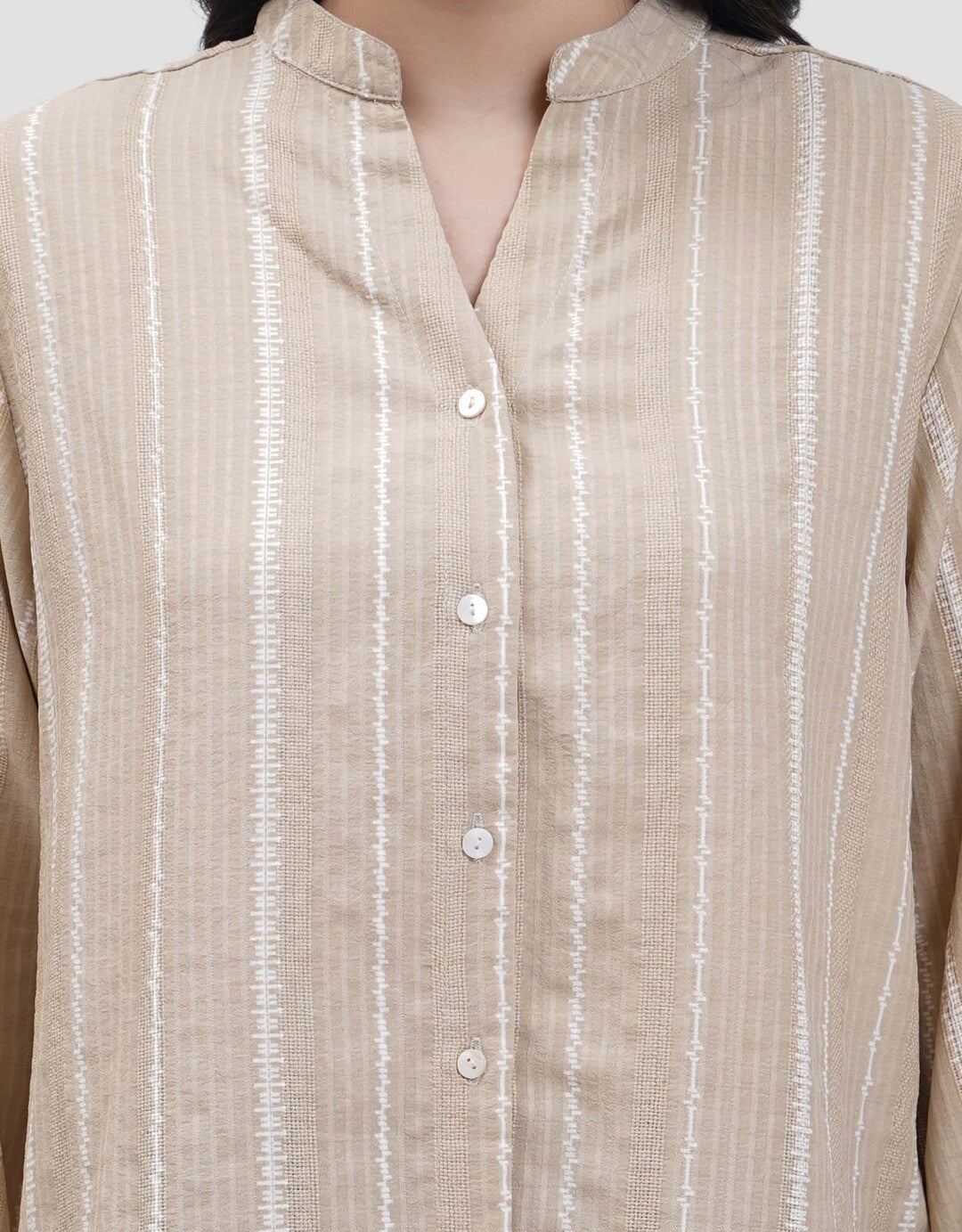 Koleksi atasan yang terlihat mewah namun tetap santai. Kemeja motif salur dengan aksen bordir vertikal ini adalah pilihan sempurna. Kombinasi warna kalem yang hangat dan detail bordir putihnya memberikan kesan eksklusif.