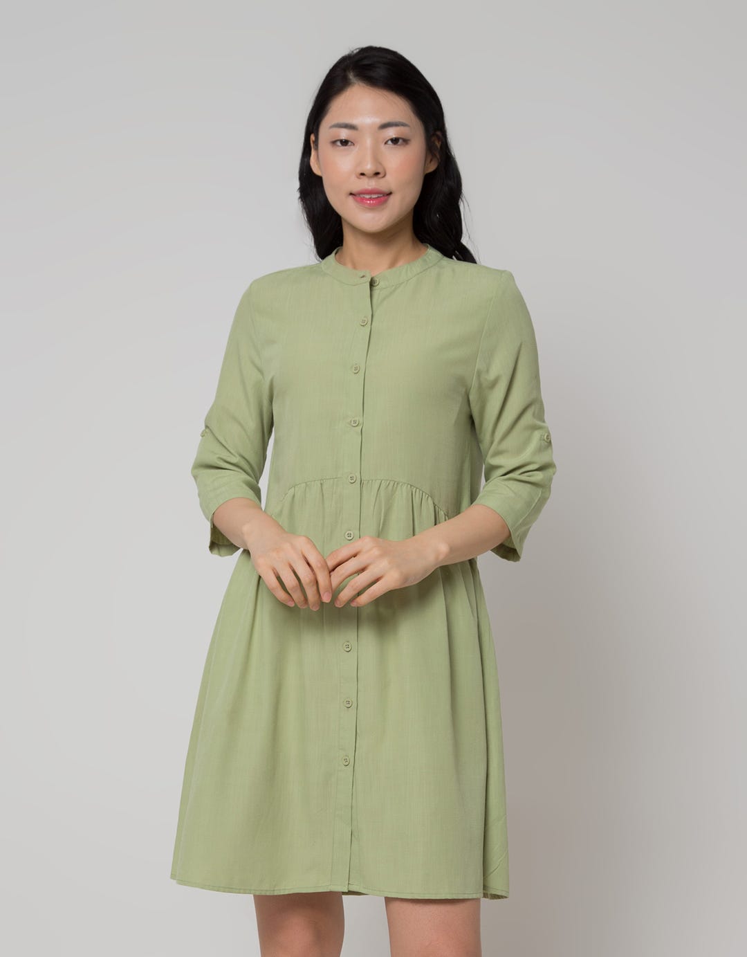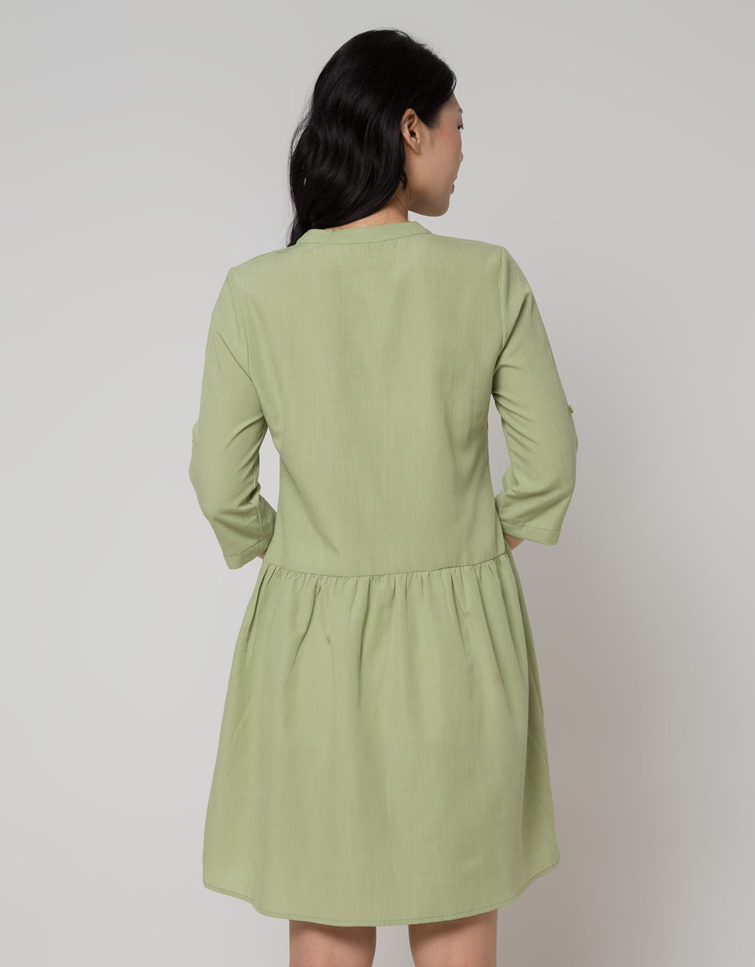 Details Midi Dress With 7/8 Sleeves And Half Moon Frill At Waist