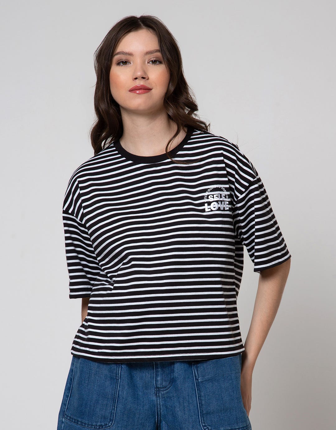 Details Short Sleeve T-Shirt Tee Round Neck Pink Stripes