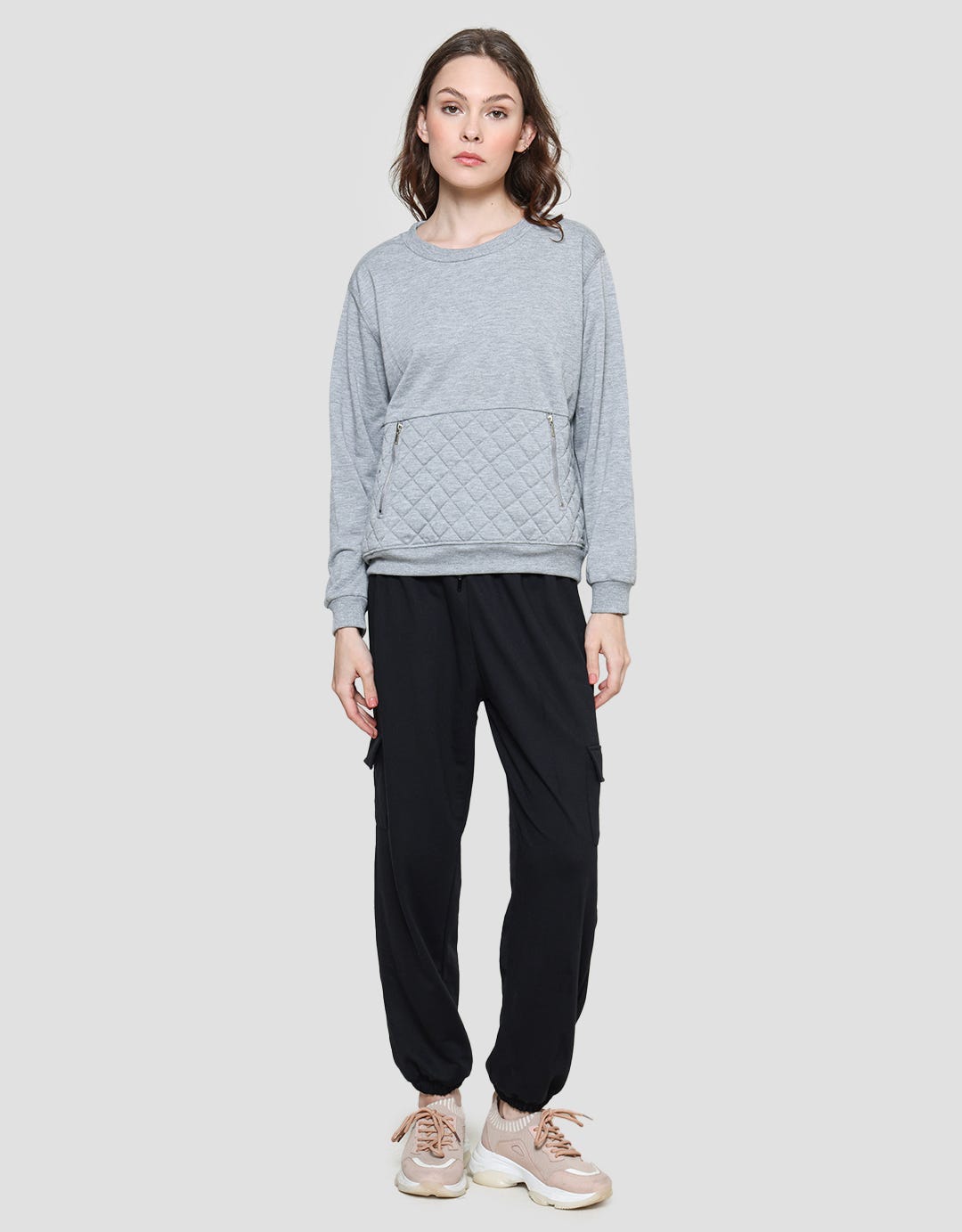 Details Sweater Quilted Kangaroo Pocket And Zipper Wanita