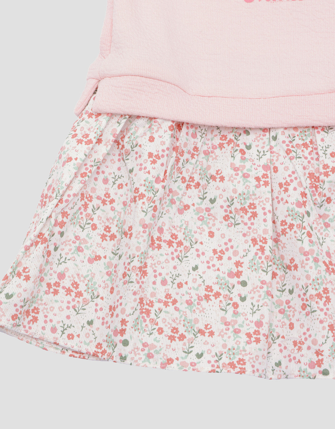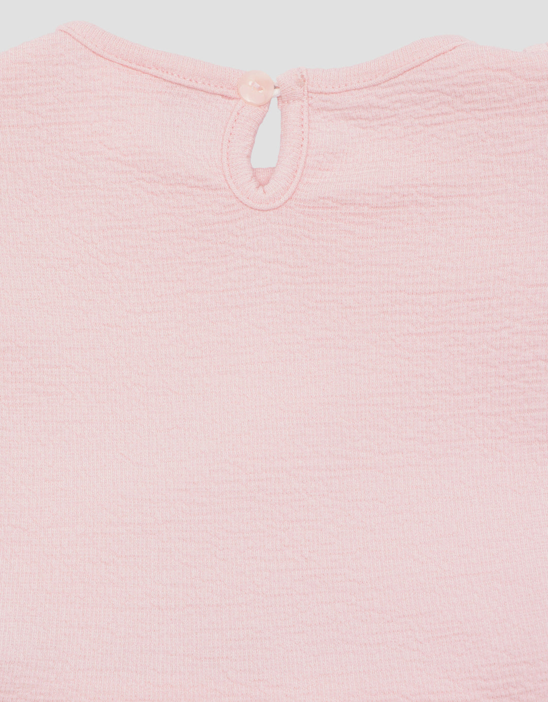 - Detail kerah bulat, lengan pendek, kancing belakang