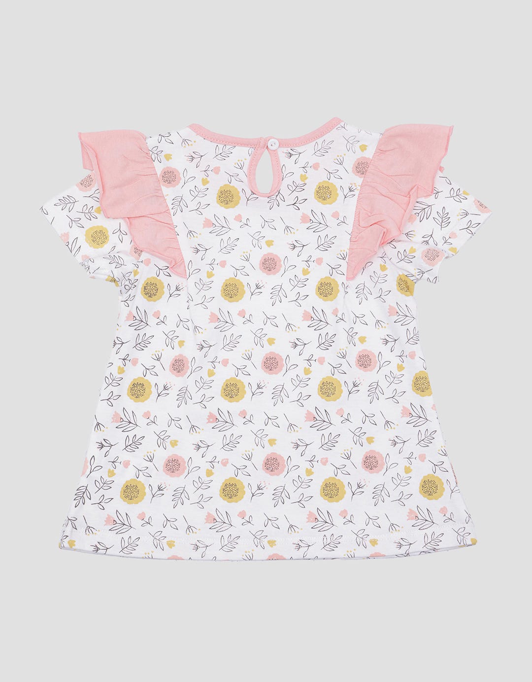 - Detail kerah bulat, lengan pendek dengan ruffle