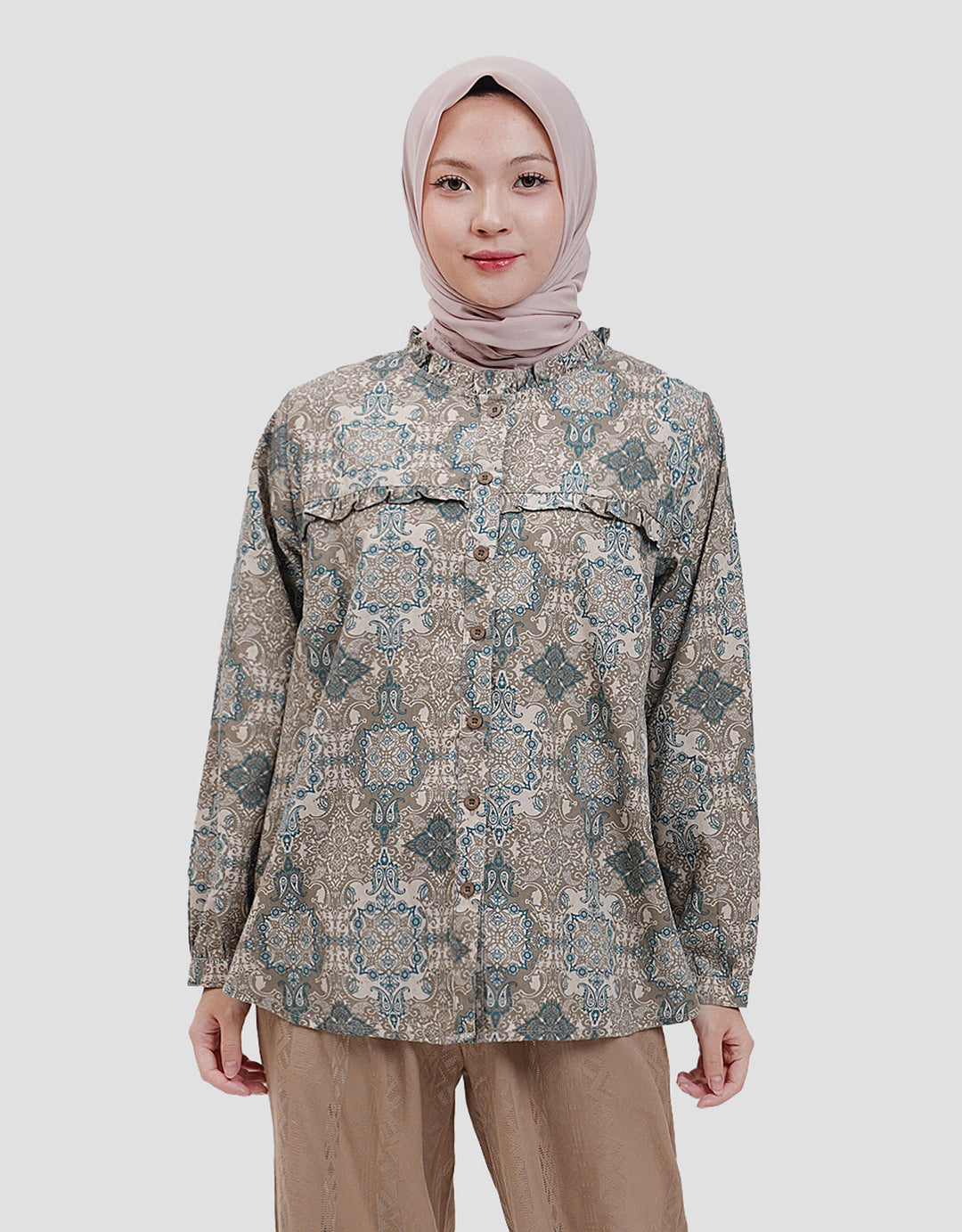 Blouse motif print yang feminim dan elegan hadir untuk melengkapi daily wear berkualitas. Padu padan sempurna dengan detail akasen ruffle dan kancing depan yang manis. Balutan material yang lembut dan ringan, menambah kenyamanan di sepanjang aktivitas.
