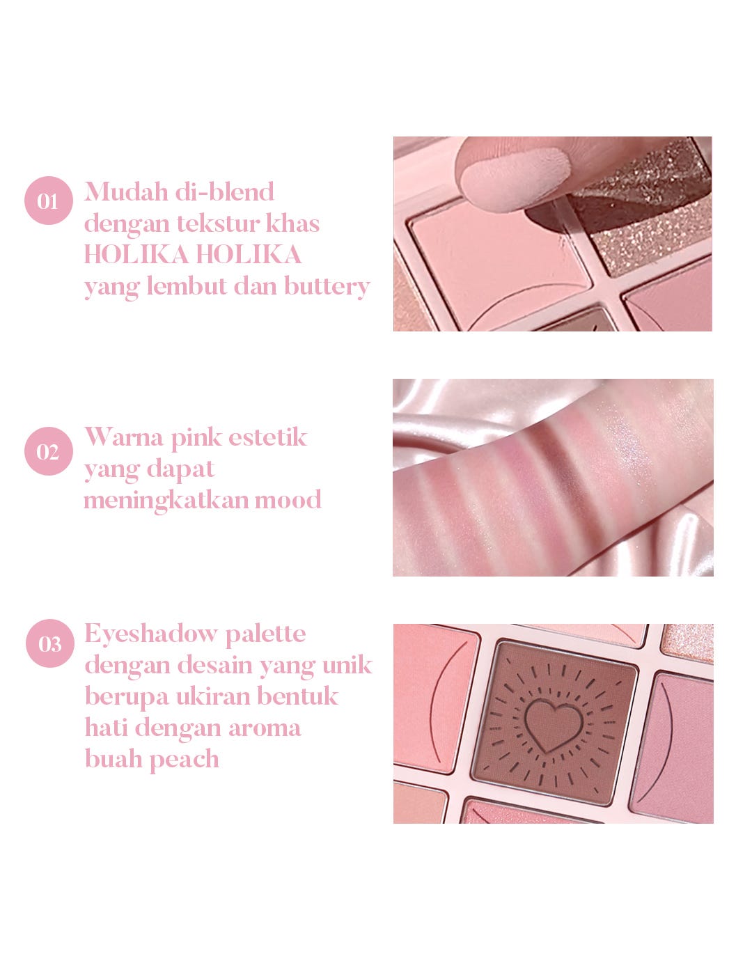 Percantik tampilan wajah Anda dengan Eyeshadow palet dengan 9 warna (Matte, Shimmer, dan Glitter) untuk tampilan sensual dengan tema merah muda.