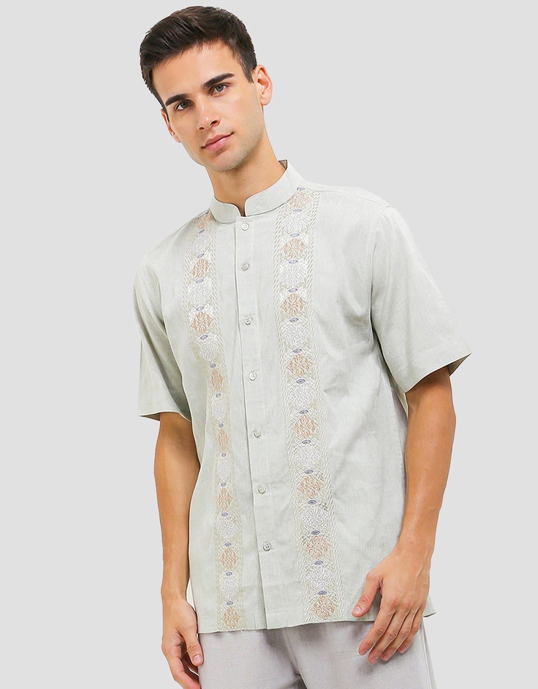 • Detail kerah tinggi, kancing depan, lengan panjang